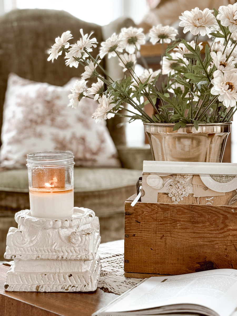 I absolutely LOVE yawll’s whole house!! Your sunroom is beautiful!! Where did you get the riser that the candle is on and also the area rug?